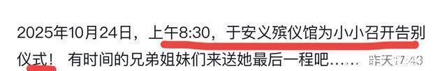 讣告还公布了袁小小将于10月24日在安义殡仪馆举行告别仪式,并希望她生前的好友,能够来送她最后一程!