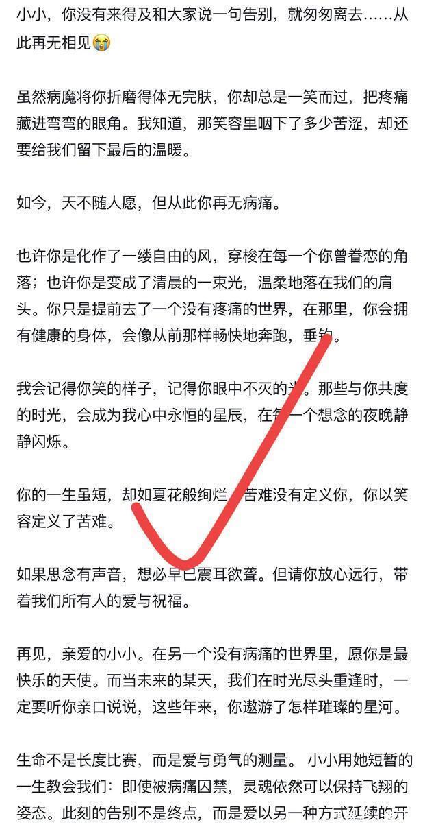 随后,袁小小的家人发布了一则讣告,证实了她去世的消息。通过讣告的内容来看,袁小小在去世前的一段时间里,身体曾经历了巨大的痛苦,以至于在临终前都没有来得及和大家告别,虽然从此天人两隔,但对于袁小小来说,也算是一种解脱。